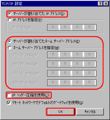 インターネットサービスプロバイダから指定がある場合は、通知された設定にしたがってください。 - 【IPヘッダー圧縮を使用】のチェックをはずしてください。
