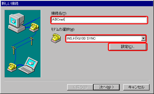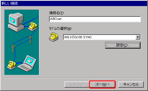 設定が済みましたら、【次へ】をクリックしてください。- ご案内の接続先番号以外の番号に接続された場合には、フレッツ・ISDN適用外となりますので、通常の通信料がかかります。