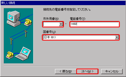 【市外局番】は空欄にし、【電話番号】は接続先番号「1492」を入力、【国番号】は【日本(81)】に設定してください。