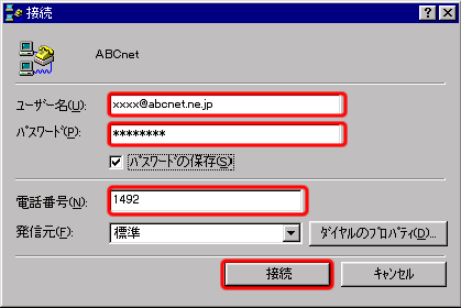 - 【パスワード】はインターネットサービスプロバイダに登録されているパスワードを入力してください。