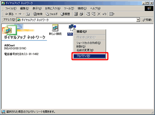 作成した接続のアイコンにポインタを合わせ、マウスの右ボタンをクリックし、【プロパティ】をクリックしてください。