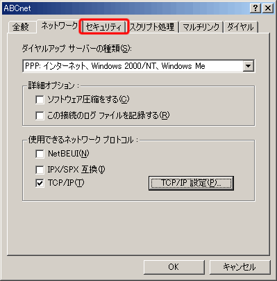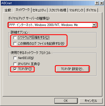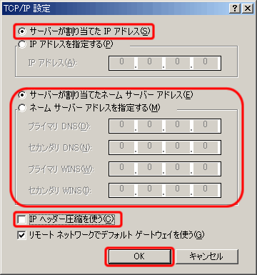インターネットサービスプロバイダから指定がある場合は、通知された設定にしたがってください。 - 【IPヘッダー圧縮を行う】のチェックをはずしてください。