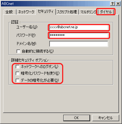 - 【パスワード】はインターネットサービスプロバイダに登録されているパスワードを入力してください。