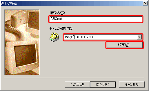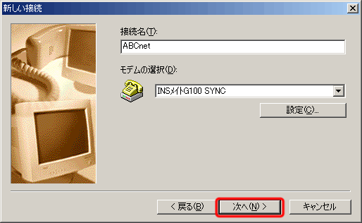 設定が済みましたら、【次へ】をクリックしてください。- ご案内の接続先番号以外の番号に接続された場合には、フレッツ・ISDN適用外となりますので、通常の通信料がかかります。