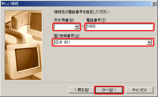 【市外局番】は空欄にし、【電話番号】は接続先番号「1492」を入力、【国番号】は【日本(81)】に設定してください。