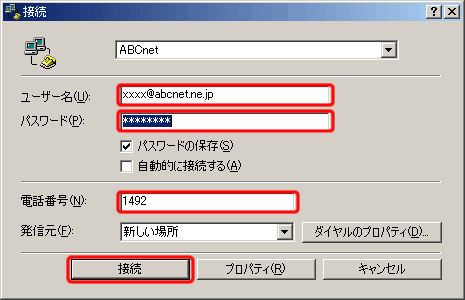 【ユーザー名】にインターネットサービスプロバイダに登録されているユーザーID(認証IDやログインIDなど)@ドメイン名、 【パスワード】にインターネットサービスプロバイダに登録されているパスワード、【電話番号】に接続先番号「1492」が入力されていることを確認してください。