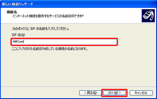 【ISP名】にインターネットサービスプロバイダ名などのわかりやすい名前を入力し、【次へ】をクリックしてください。