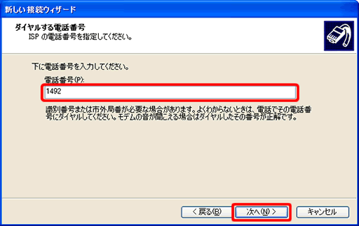 【電話番号】に接続先番号「1492」を入力し、【次へ】をクリックしてください。