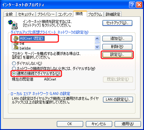手順10で作成した接続名を選択し、【通常の接続でダイヤルする】にチェックを入れ、【設定】をクリックしてください。 -