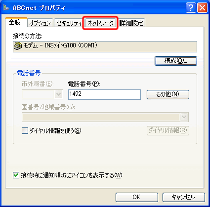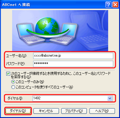 【ユーザー名】にインターネットサービスプロバイダに登録されているユーザーID(認証IDやログインIDなど)@ドメイン名、 【パスワード】にインターネットサービスプロバイダに登録されているパスワード、【ダイヤル】に接続先番号「1492」が入力されていることを確認してください。