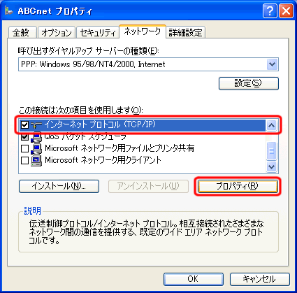 【インターネットプロトコル(TCP/IP)】を選択し、【プロパティ】をクリックしてください。