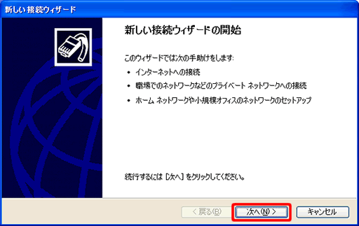 新しい接続ウィザードが表示されましたら、【次へ】をクリックしてください。
