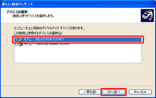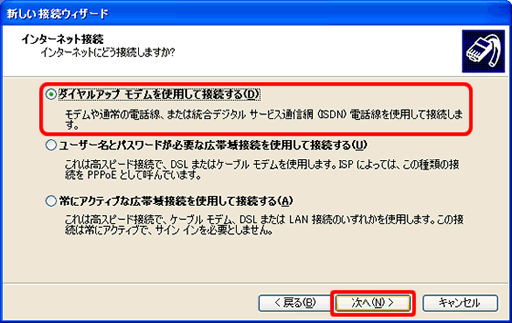 【ダイヤルアップモデムを使用して接続する】を選択し、【次へ】をクリックしてください。