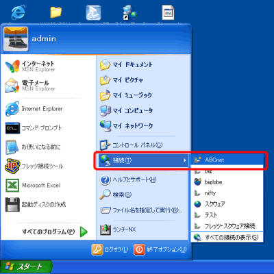 【スタート】をクリックして【接続】から手順10で作成した接続名をクリックしてください。