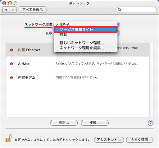 「ネットワーク環境」のプルダウンメニューから、希望の接続先を選択してください。