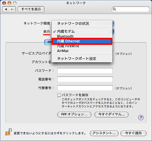 「表示」のプルダウンメニューから、【内蔵Ethernet】を選択してください。
