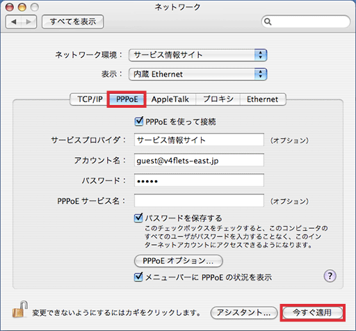 【PPPoE】タブをクリックし、各設定内容を確認して、【今すぐ適用】をクリックしてください。