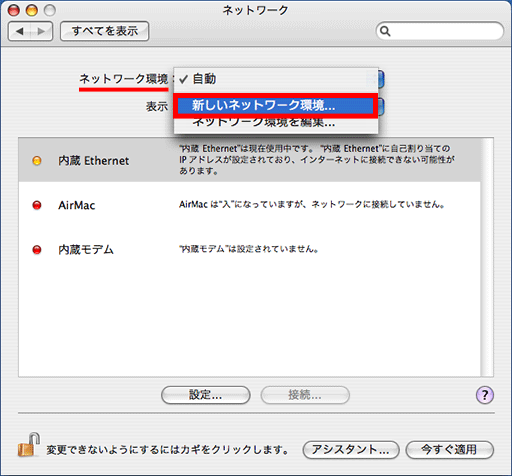 「ネットワーク環境」のプルダウンメニューから【新しいネットワーク環境】を選択してください。