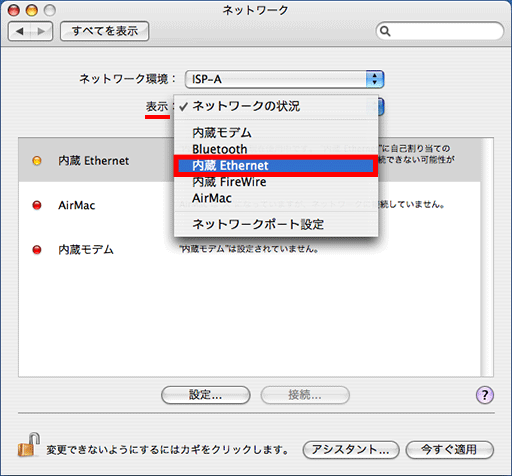 「表示」のプルダウンメニューから【内蔵 Ethernet】を選択してください。