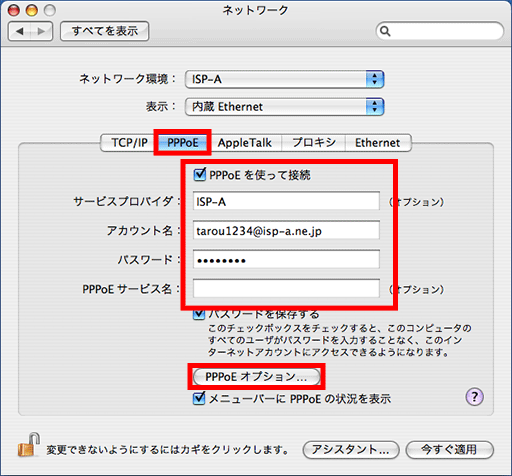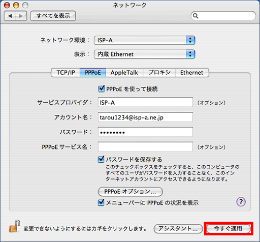 PPPoEの設定: Mac OS 10.4 インターネットへの接続先設定方法