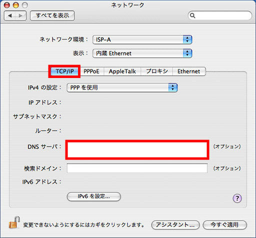 DNSサーバーアドレスを指定するインターネットサービスプロバイダをご利用の場合は、【TCP/IP】タブをクリックし、【DNSサーバ】欄に指定されたDNSサーバーのIPアドレスを入力してください。