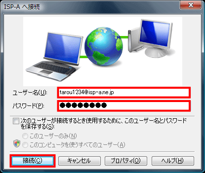 パスワードを保存しない設定になっている場合、ダイアログボックスが表示されますので、【パスワード】を入力し、【接続】をクリックしてください。