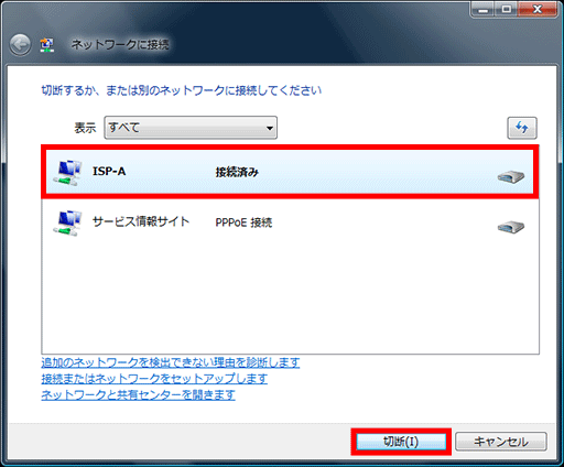 「ネットワークに接続」画面が表示されますので、「接続済み」のネットワーク(接続先)を選択し、【切断】をクリックしてください。