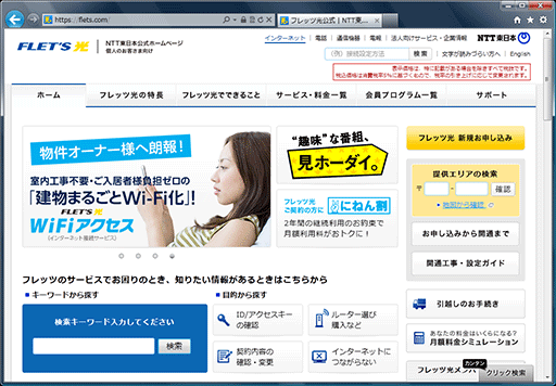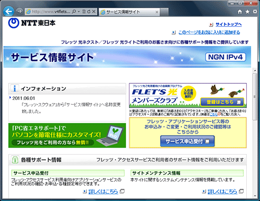 インターネット接続の場合 ホームページのURLを入力してください。(例:http://flets.com/) NGN接続の場合 「http://www.v4flets-east.jp/」と入力してください。
