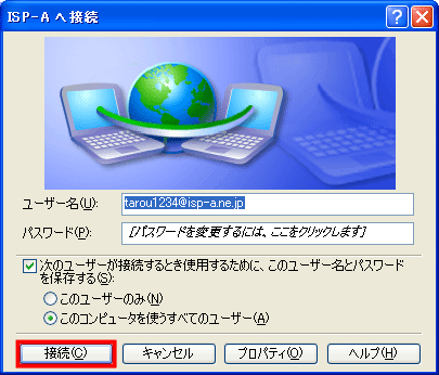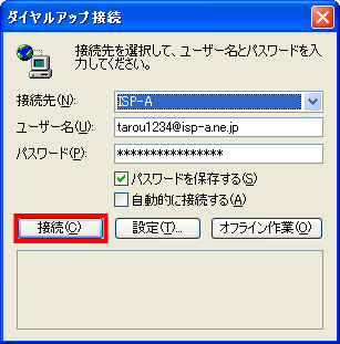 設定後、Internet Explorerを起動すると、「ダイヤルアップ接続」画面が表示されるようになりますので、【接続】をクリックしてください。