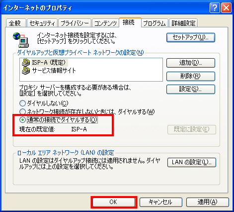 「インターネットのプロパティ」画面で、お客さまが作成したアイコンの名前が(既定)となっていることを確認し、【通常の接続でダイヤルする】を選択し、【OK】をクリックしてください。