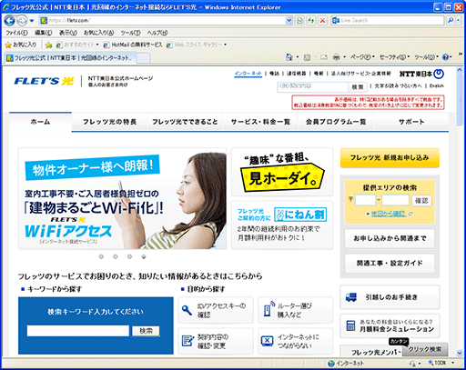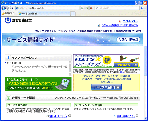 インターネット接続の場合 ホームページのURLを入力してください。(例:http://flets.com/) NGN接続の場合 「http://www.v4flets-east.jp/」と入力してください。