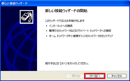 「新しい接続ウィザードの開始」画面が表示されますので、【次へ】をクリックしてください。