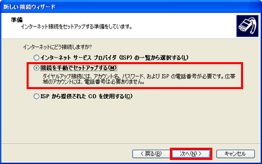 【接続を手動でセットアップする】を選択し、【次へ】をクリックしてください。