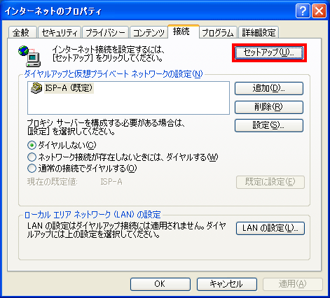 「インターネットのプロパティ」画面が表示されますので、【セットアップ】をクリックしてください。
