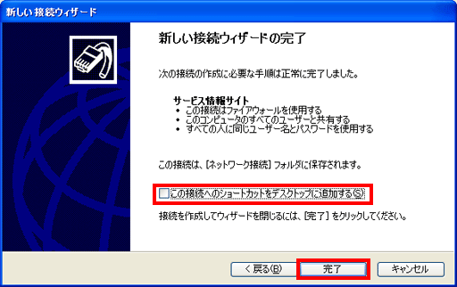 ショートカットが必要な場合は【この接続へのショートカットをデスクトップに追加する】にチェックを入れてください。