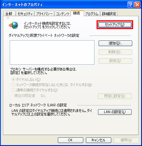 「インターネットのプロパティ」画面が表示されますので、【セットアップ】をクリックしてください。