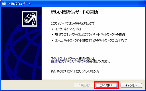 「新しい接続ウィザードの開始」画面が表示されますので、【次へ】をクリックしてください。