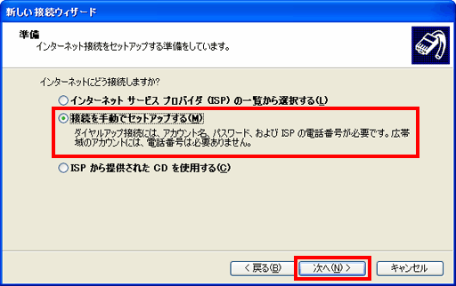 【接続を手動でセットアップする】を選択し、【次へ】をクリックしてください。
