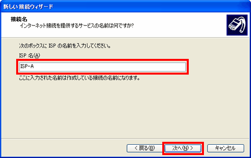 「ISP名」にお客さま任意の名前を入力し、【次へ】をクリックしてください。