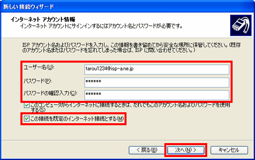 (例)passwordまた、通常ご利用になるインターネットサービスプロバイダの設定を行う場合には、【この接続を既定のインターネット接続とする】にチェックが入っていることを確認し、【次へ】をクリックしてください。