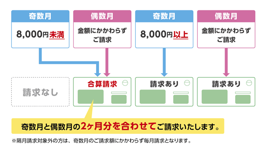 奇数月(1・3・5・7・9・11月)のご請求額が一定額8,000円(税込)未満の場合は、翌月の偶数月(2・4・6・8・10・12月)に2ヶ月分をまとめてご請求させていただきます。