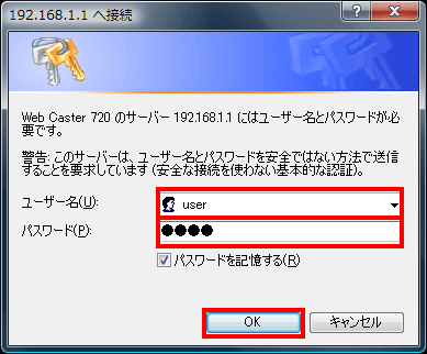 ユーザー名、パスワードを入力し、【OK】ボタンをクリックしてください。ユーザー名 設定したユーザー名を入力してください。