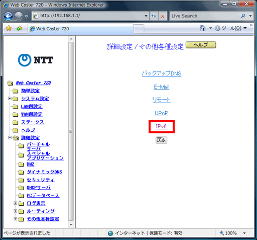 「詳細設定/その他各種設定/IPv6」画面が表示されます。