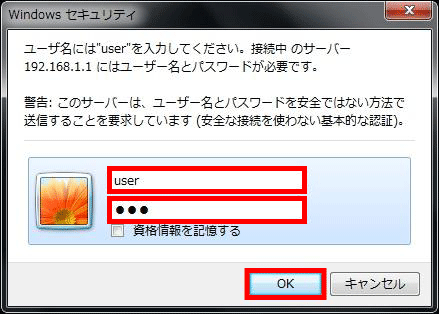 ユーザー名、パスワードを入力し、【OK】ボタンをクリックしてください。ユーザー名 「user」と入力してください。 パスワード パスワード:初期設定で設定したパスワードを入力してください。