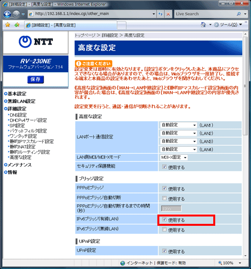 「IPv6ブリッジ(有線LAN)」の【使用する】を選択してください。- 無線LANをご利用の方は、「IPv6ブリッジ(無線LAN)」の【使用する】を選択してください。