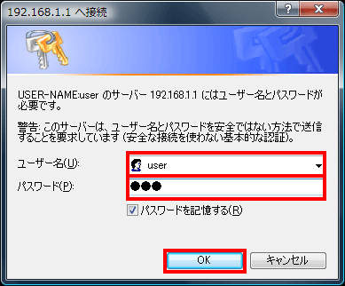 ユーザー名、パスワードを入力し、【OK】ボタンをクリックしてください。ユーザー名 「user」と入力してください。 パスワード パスワード:初期設定で設定したパスワードを入力してください。