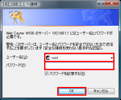 ユーザー名、パスワードを入力し、【OK】ボタンをクリックしてください。ユーザー名 「root」と入力してください。 パスワード パスワードを設定している場合は、設定したパスワードを入力してください。